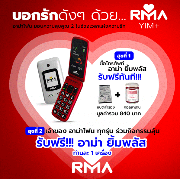 กรุงเทพฯ 16 กุมภาพันธ์ 2564 – บริษัท อาม่า โฟน จำกัด จัดแคมเปญโปรโมชันรับต้นปีเอาใจสาวกมอบความสุขคูณ 2 ตลอดช่วงเวลาแห่งความรัก โปรโมชันความสุขที่ 1 เพียงซื้อ “อาม่า ยิ้มพลัส” (RMA YIM+) โทรศัพท์มือถือฝาพับรุ่นใหม่ล่าสุดที่มาพร้อมฟังก์ชั่นการใช้งานที่แสนสะดวกสำหรับผู้สูงอายุ เปิดฝารับสาย ปิดฝาก็วางสาย รวมถึงปุ่มใหญ่ใช้ง่าย ราคา 2,390 บาท รับฟรีทันที แบตเตอรี่สำรอง และ AMARA Collagen มูลค่ารวม 840 บาท ส่วนโปรโมชันความสุขที่ 2 เชิญชวนร่วมสนุกกิจกรรมถ่ายภาพคนที่คุณรักคู่กับโทรศัพท์อาม่าโฟนรุ่นใดก็ได้ พร้อมพิมพ์ข้อความแสดงความรักและห่วงใยผ่านทางเฟซบุ๊ก RMaPhone ก็มีสิทธิ์ลุ้นรับฟรีโทรศัพท์มือถือ “อาม่า ยิ้มพลัส” (RMA YIM+) 1 เครื่อง จำนวน 5 รางวัล โดยผู้สนใจสามารถร่วมกิจกรรมได้ที่เฟซบุ๊ก www.facebook.com/RMaPhone ได้ตั้งแต่วันนี้จนถึงวันที่ 14 มีนาคม 2564 สอบถามรายละเอียดเพิ่มเติมได้ที่ ไลน์ไอดี @rmaphone หรือ https://lin.ee/bvmigD โทรศัพท์ 081-302-1111 และเว็บไซต์ www.rmaphone.co.th