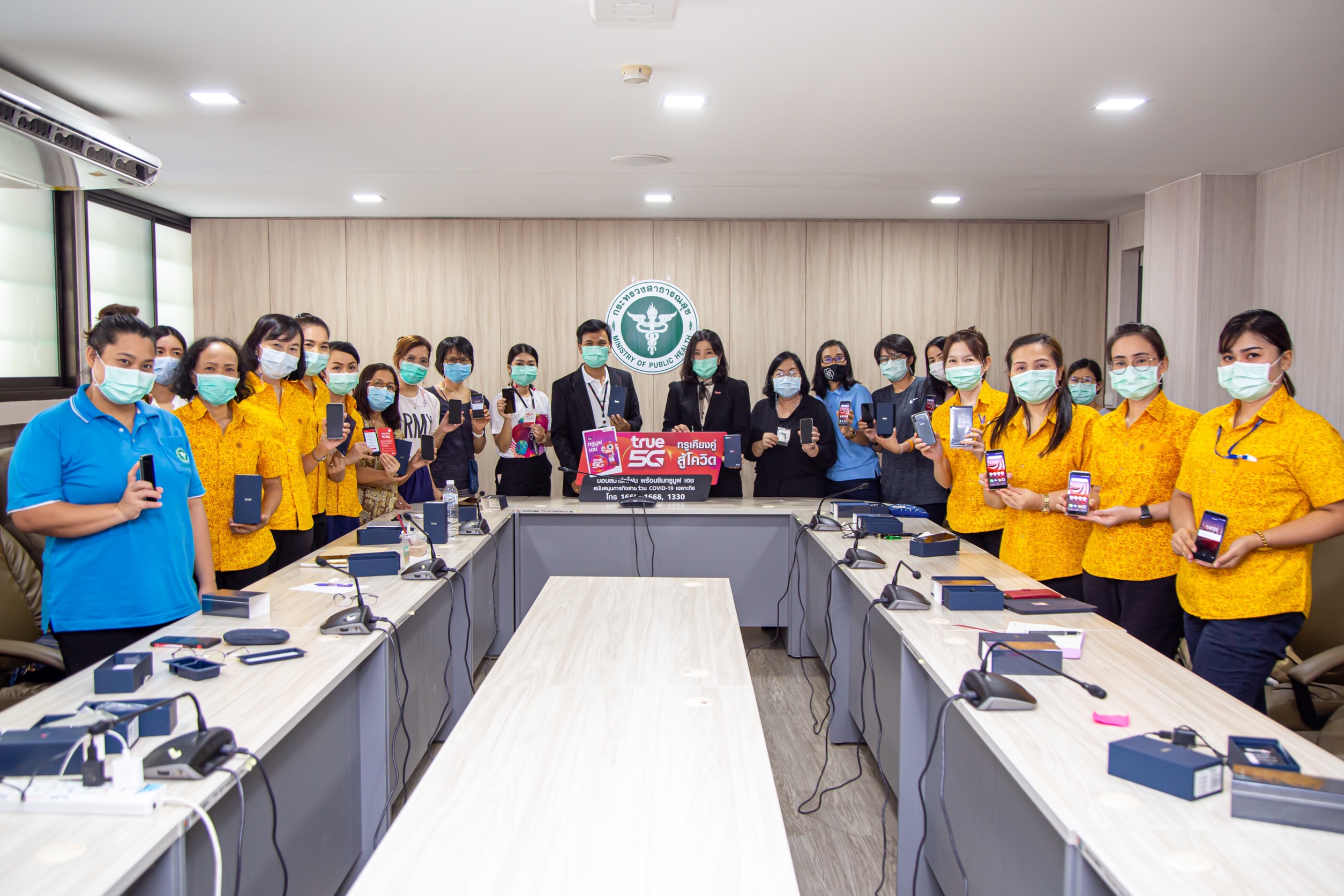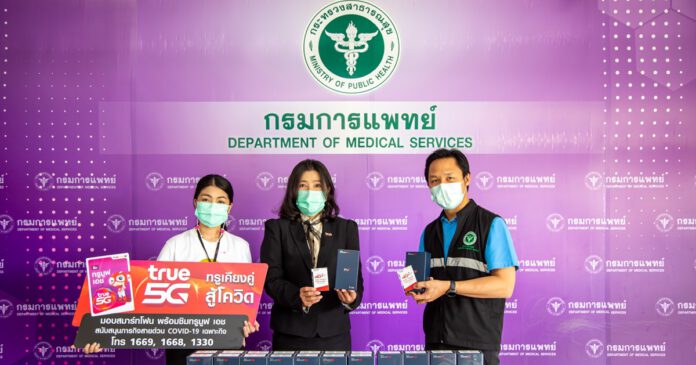 กรุงเทพฯ 24 เมษายน 2564 – ในขณะที่ยอดผู้ติดเชื้อโควิด-19 พุ่งสูงขึ้นอย่างต่อเนื่อง รัฐบาลต้องเร่งรับมือกับสถานการณ์ดังกล่าวให้ทันท่วงที ซึ่งมาตรการหนึ่งในนั้นคือ การจัดตั้งสายด่วน COVID-19 เฉพาะกิจ และเพื่อเชื่อมต่อการสื่อสารให้พร้อมช่วยเหลือผู้ป่วยโควิด-19 ได้อย่างราบรื่น ไม่สะดุด กลุ่มทรู โดยนางพิมลพรรณ ศิริวงศ์วานงาม (กลาง) ผู้อำนวยการ สายงานสื่อสารองค์กรและประชาสัมพันธ์การตลาด บมจ. ทรู คอร์ปอเรชั่น จึงมอบสมาร์ทโฟน พร้อมซิมจากทรูมูฟ เอช จำนวน 30 ชุด แพ็กเกจโทรฟรีทุกเครือข่าย และอินเทอร์เน็ตฟรีไม่จำกัด ตลอด 24 ชั่วโมง นาน 1 ปี แก่กรมการแพทย์ กระทรวงสาธารณสุข โดยนายแพทย์สกานต์ บุนนาค (ขวาสุด) รักษาการ ผู้อำนวยการ สถาบันเวชศาสตร์ฯ ผู้สูงอายุ ในการสนับสนุนภารกิจสายด่วน COVID-19 เฉพาะกิจ ได้แก่ 1668 กรมการแพทย์, 1669 สถาบันการแพทย์ฉุกเฉินแห่งชาติ และ 1330 สำนักงานหลักประกันสุขภาพแห่งชาติ (สปสช.) อีกทั้ง ยังได้แนะนำวิธีการใช้งานแก่เจ้าหน้าที่จิตอาสา อำนวยความสะดวกให้สามารถปฏิบัติงาน ติดต่อสื่อสารกลับ ให้คำปรึกษา สอบถามอาการและประสานงานจัดหาเตียงในโรงพยาบาลเพื่อรองรับการนอนพักรักษาตัวสำหรับผู้ป่วยที่ติดเชื้อโควิด-19 ซึ่งเป็นส่วนหนึ่งของความตั้งใจของกลุ่มทรู ภายใต้โครงการซีพี ร้อยเรียงใจ สู้ภัยโควิด-19 ที่พร้อมนำศักยภาพด้านเทคโนโลยีสื่อสารดิจิทัล มาสนับสนุนภารกิจของทุกภาคส่วน รวมถึงภาคสาธารณสุข ตลอดจนเดินหน้าส่งต่อความช่วยเหลือครอบคลุมทุกมิติ เพื่อเป็นอีกหนึ่งกำลังใจเคียงคู่พี่น้องชาวไทยให้ชนะวิกฤตโควิด-19 ไปด้วยกัน