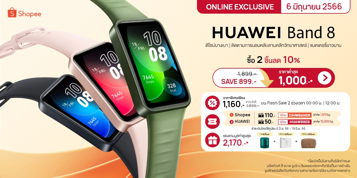 - สำหรับ HUAWEI Band 8รับคูปองส่วนลดเพิ่มอีกสูงสุด 160บาท เหลืองเพียง 1,000บาท โดยโค้ดส่วนลด ประกอบด้วยคูปองส่วนลดเพิ่มจากหัวเว่ยมูลค่า 50บาท เพียงใส่โค้ด HUAWB8EB และคูปองส่วนลดเพิ่มจากShopee มูลค่า 110 บาท เพียงใส่โค้ด 23HWBAND8