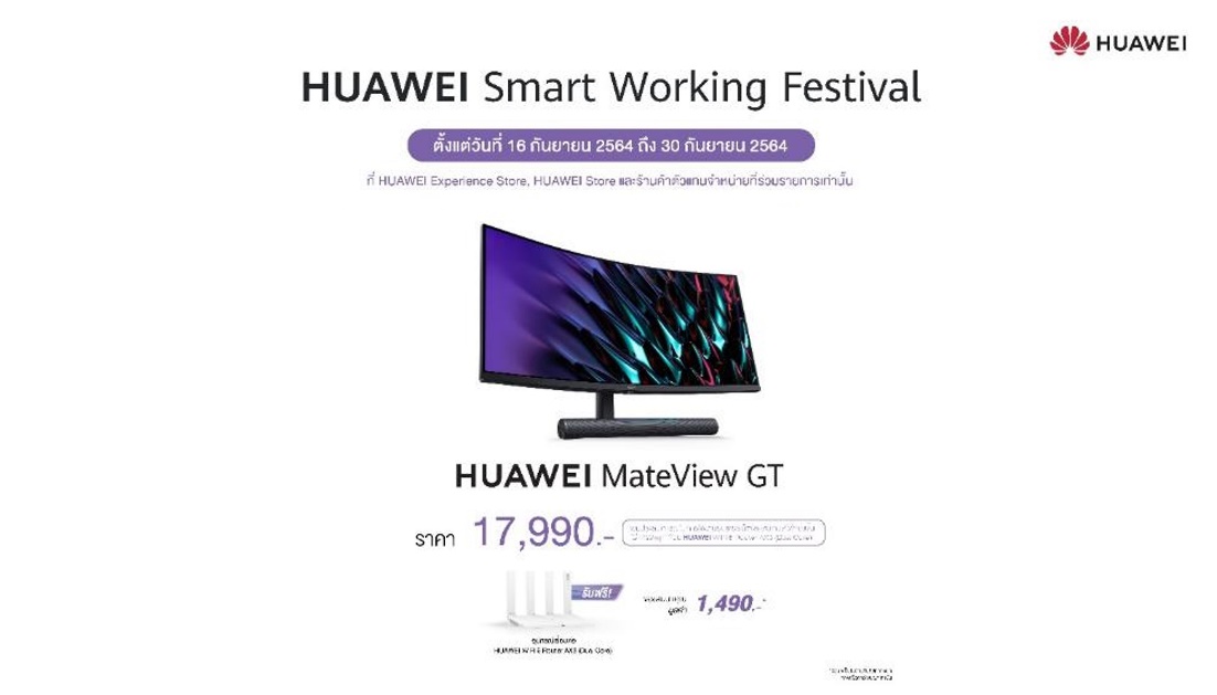 พิเศษ! อัพเกรดดีไวซ์เป็นของที่ใช่และคู่ควรแบบไม่ต้องกลัวน้อยหน้าใครได้แล้วทั้ง HUAWEI MateView GT และ HUAWEI MateBook D 15 รวมไปถึงสมาร์ทดีไวซ์อื่นๆ ที่มาพร้อมข้อเสนอสุดคุ้ม1 ในเทศกาล HUAWEI Smart Working Festival ตามรายละเอียดด้านล่างนี้ ตั้งแต่วันที่ 16 กันยายน 2564 – 30 กันยายน 2564 ที่ HUAWEI Experience Store, HUAWEI Store และร้านค้าที่ร่วมรายการเท่านั้น โดยสามารถดูรายละเอียดเพิ่มเติมได้ทันทีที่นี่ และผ่านช่องทางออนไลน์แพลตฟอร์มต่างๆ ทั้ง เฟซบุ๊กเพจ Huawei Mobile TH | Line | Shopee | Lazada