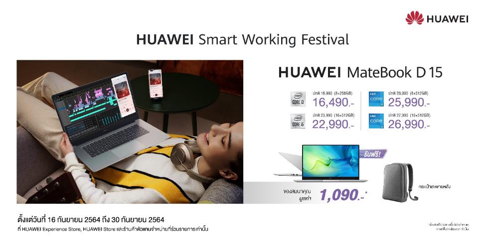 • HUAWEI MateBook D 15 มาในราคาสุดพิเศษตามประเภทของชิปเซ็ต รับไปจุกๆ กับของสมนาคุณ HUAWEI Backpack มูลค่า 1,090 บาท