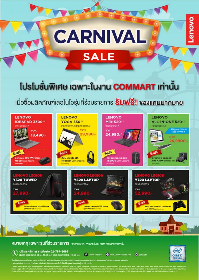 กรุงเทพฯ, ประเทศไทย – 20 มิถุนายน 2561: เลอโนโว ผู้นำยอดขายคอมพิวเตอร์อันดับ 1 จัดแคมเปญ Carnival Sale ขนสินค้าเรือธงตั้งแต่ Lenovo Ideapad, Lenovo Yoga, Lenovo Miix, Lenovo All in One และ Lenovo Legion เอาใจคอโน๊ตบุ๊คทุกท่านที่กำลังมองหาคอมพิวเตอร์สเปคแรง ในราคาโดนใจ พร้อมส่วนลด และของแถมมากมาย ที่งาน Commart ระหว่างวันที่ 21 – 24 มิถุนายน 2561 ที่บูธ เลอโนโว P3 Zone Plenary Hall ณ ศูนย์การประชุมแห่งชาติสิริกิติ์ เมื่อลูกค้าซื้อผลิตภัณฑ์โน๊ตบุ๊ค แท็บเล็ต และคอมพิวเตอร์รุ่นที่ร่วมรายการในงาน Commart รับฟรี! หูฟัง JBL*, Lenovo Wireless Mouse*, กระเป๋าเป้ Targus*, Creative Speaker*, และอุปกรณ์ไอทีอื่นๆที่น่าสนใจอีกมากมาย