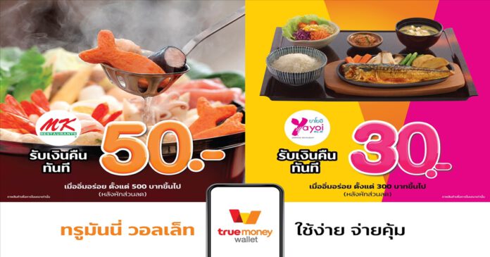 พิเศษ! กับแคมเปญ “ใช้ง่าย จ่ายคุ้ม” เพียงลูกค้าชำระเงินผ่านแอปฯ TrueMoney Wallet เมื่อทาน อาหารที่ “MK” มูลค่าครบ 500 บาท รับเงินคืน 50 บาท หรือเลือกทานอาหารญี่ปุ่นที่ “ยาโยอิ” มูลค่าครบ 300 บาท รับเงินคืน 30 บาท ตั้งแต่วันนี้ถึง 31 พฤษภาคม 2564 (หรือจนกว่าจำนวนสิทธิ์จะหมด) เพื่อหลีกเลี่ยงการสัมผัสและความเสี่ยงจากการติดเชื้อโรคจากเงินสด