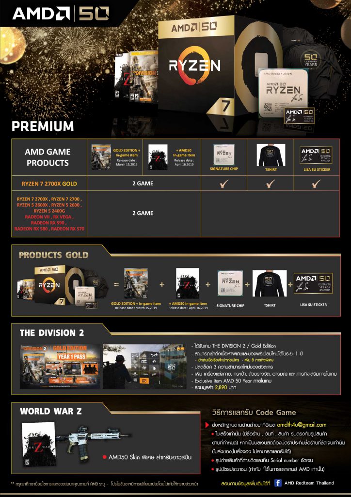 เมื่อซื้อชิปประมวลผล AMD Ryzen หรือกราฟิกการ์ด AMD Radeon รุ่นที่ร่วมรายการด้านล่าง รับไปเลยโค้ดเกม World War Z และ Tom Clancy’s The Division® 2 Gold Edition