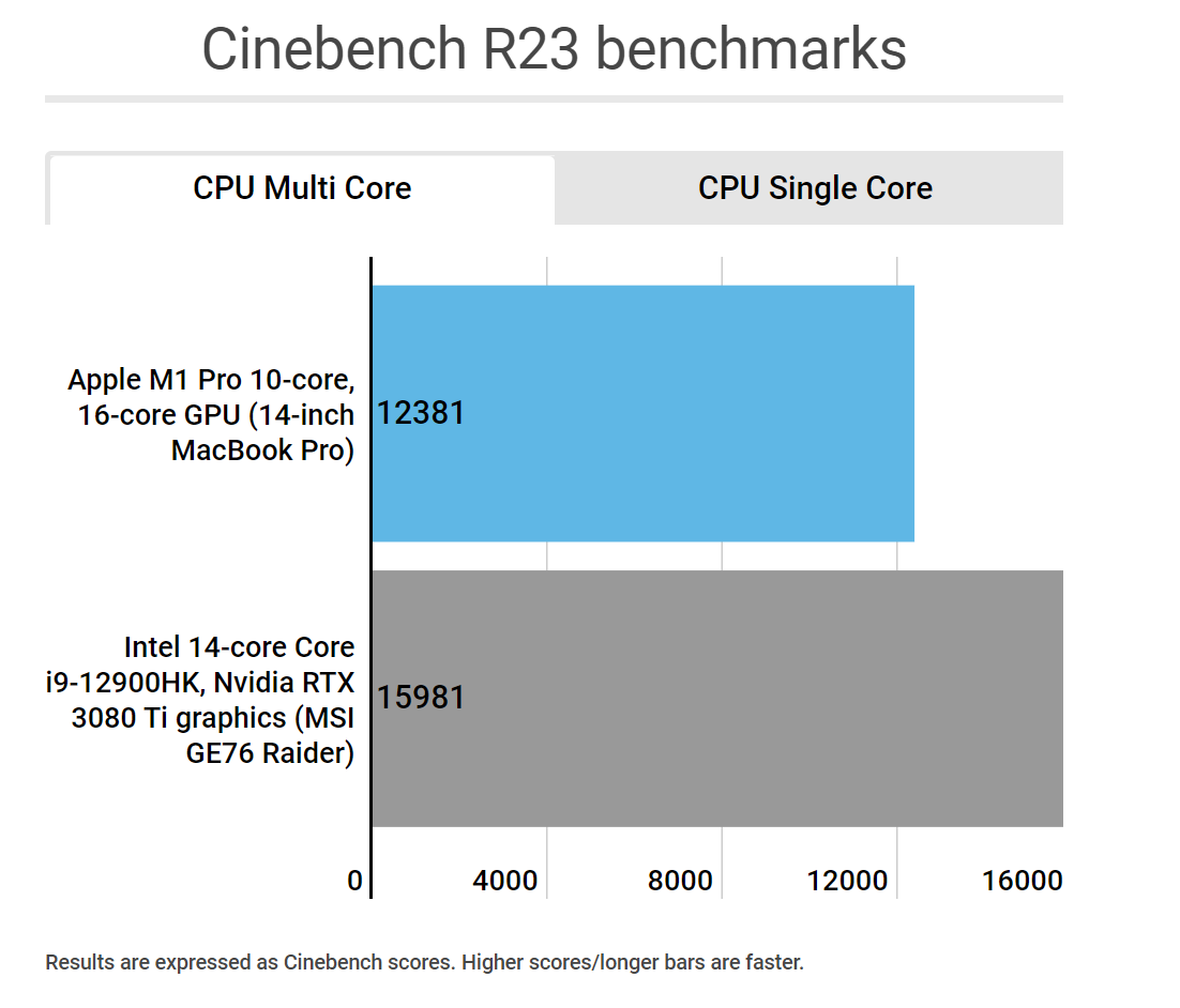 แต่คู่แข่งที่จะลืมไม่ได้เลยนั่นคือ Apple Silicon ที่ Intel เคยโดนค่ายผลไม้ขิงมาก่อน จึงขอตอกกลับด้วย Intel Core i9-12900HK นำมาเทียบกับ Apple M1 Pro และ M1 Max ใน Geekbench 5 และ Cinebench R23 ผลปรากฏว่า Intel ชนะทั้งคะแนนของ Single-Core และ Multi-Core