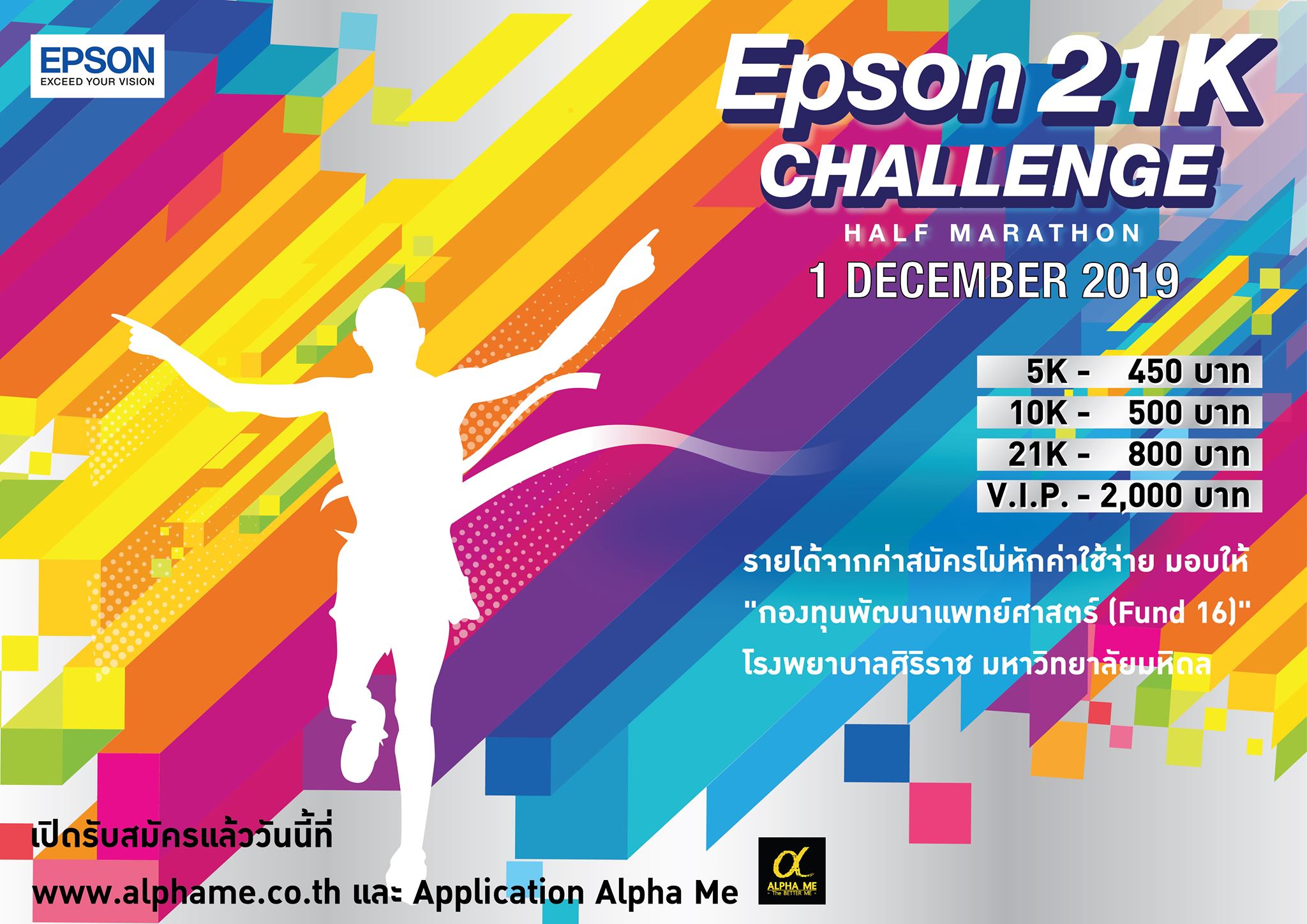 เอปสัน ประเทศไทย ชวนนักวิ่งใจดีร่วมวิ่งสร้างคนและพัฒนาวงการแพทย์อย่างยั่งยืนง่ายๆ ด้วยสองขาของคุณ ในงาน Epson 21K Challenge งานวิ่งครั้งใหญ่ส่งท้ายปี มี 3 ระยะ ได้แก่ ฮาล์ฟมาราธอน 21 กิโลเมตร ค่าสมัคร 800 บาท มินิฮาล์ฟมาราธอน 10 กิโลเมตร ค่าสมัคร 500 บาท Fun Run 5 กิโลเมตร ค่าสมัคร 450 บาท  ผู้สมัครทุกระยะจะได้รับเสื้อวิ่งและเหรียญรางวัล พร้อมสิทธิ์ชิงเงินรางวัลรวมมูลค่ากว่า 138,000 บาท โดยรายได้ทั้งหมดไม่หักค่าใช้จ่ายจะถูกนำไปมอบให้กองทุนพัฒนาแพทย์ศาสตร์ คณะแพทยศาสตร์ศิริราชพยาบาล  เชิญมาร่วมแสดงพลังสร้างคนวงการแพทย์พร้อมกัน ในวันอาทิตย์ที่ 1 ธันวาคม 2562 ณ มหาวิทยาลัยเทคโนโลยีราชมงคลกรุงเทพ ถนนนราธิวาสราชนครินทร์ ดูรายละเอียดเพิ่มเติมได้ที่ https://www.facebook.com/Epson21KChallenge/