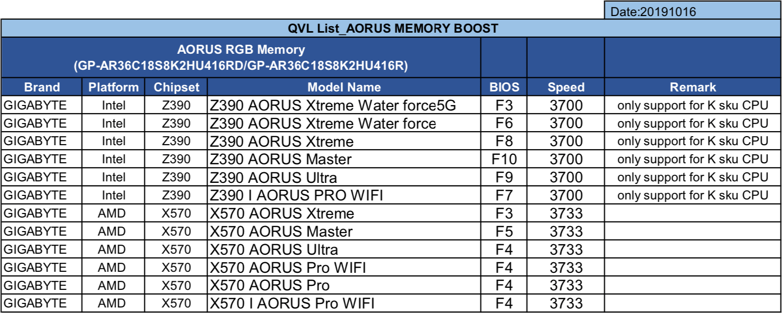 สำหรับแรมที่มีการโฆษณา จะเป็นแรม 8GB x2 บัส 3600 MHz พร้อมค่า Timing 18-19-19-39 ส่วนฟีเจอร์ Aorus Boost จะช่วยเพิ่มบัสได้ แต่ต้องใช้งานคู่กับเมนบอร์ด Aorus เฉพาะรุ่น โดยบอร์ด Z390 จะบูสตได้ 3700 MHz ส่วน X570 จะได้ 3733 MHz