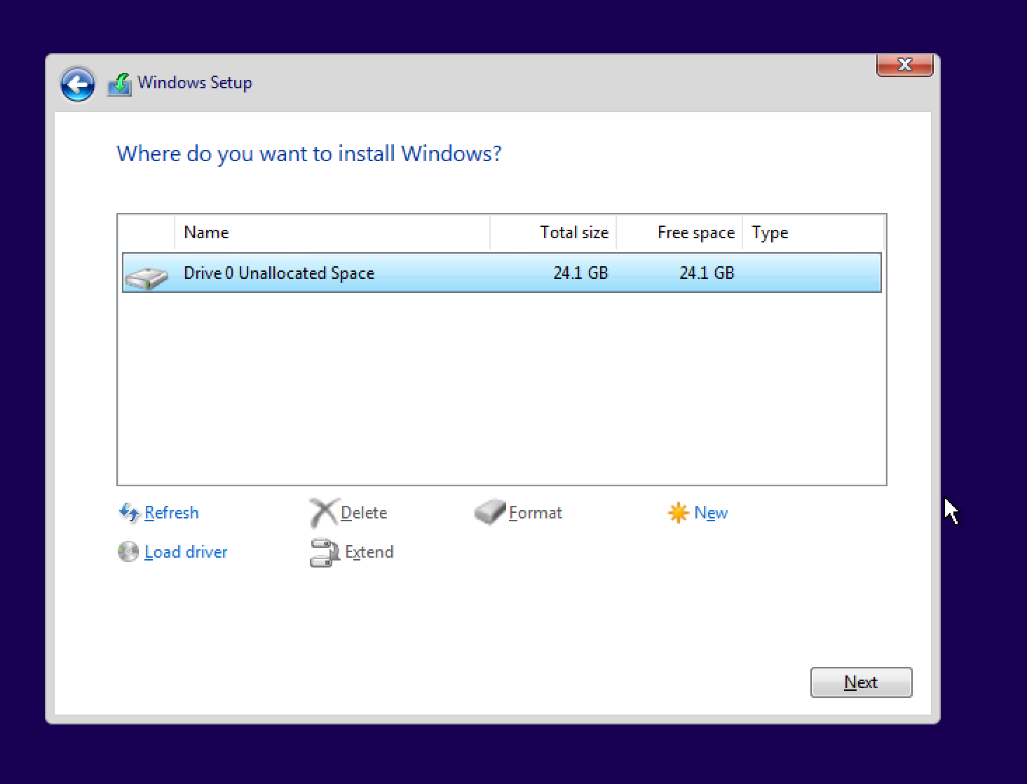 ในหน้าถัดไปจะขึ้นไดรฟ์ที่เราสามารถติดตั้ง Windows ได้ ให้เราเลือกไดรฟ์ที่ต้องการแล้วกด New ซึ่งมันจะให้เรากดเลือกว่าจะสร้างไดรฟ์ที่มีพื้นที่เท่าไร ลองคำนวณเอานะครับว่า 1024 MB = 1GB คุณจะเลือกไดรฟ์กี่ GB ก็คูณหารเอาเอง