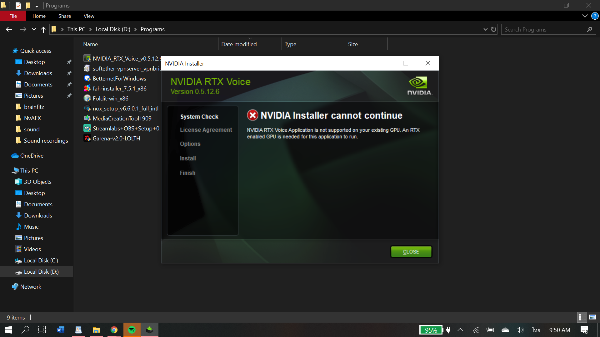 ในตอนแรกหากคุณดาวน์โหลด RTX Voice จากลิ้งก์ของ NVIDIA มา หากไม่ได้ใช้การ์ดจอ RTX มันจะขึ้นแจ้งเตือนว่าฮาร์ดแวร์ของคุณไม่รองรับ ดังนั้น เราจะต้องปรับแก้ไข้โค้ดของมันเล็กน้อย