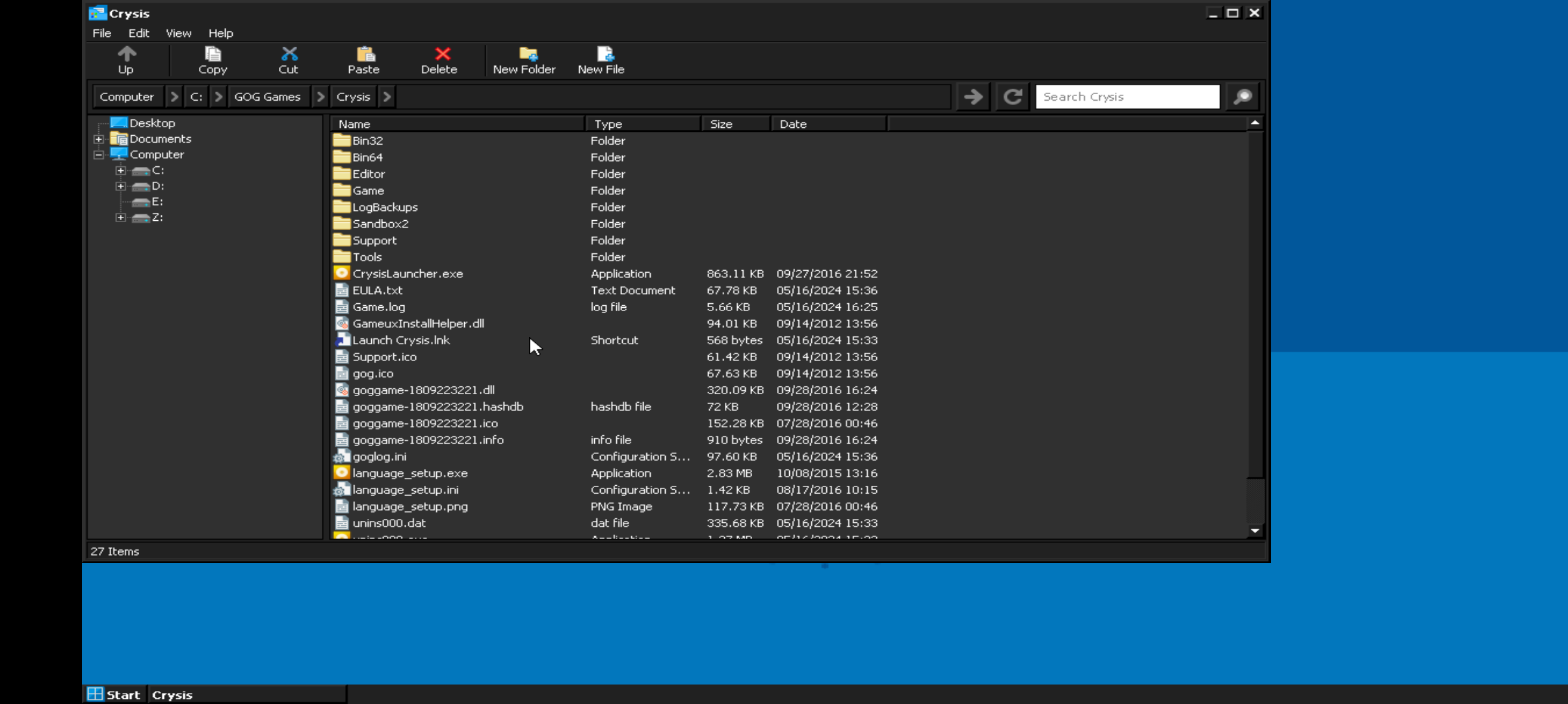 พอเปิดโฟลเดอร์เกมขึ้นมา ไอเดียคือเราต้องตามหาไฟล์ exe ของเกมนั้น ซึ่งของผมคือต้องตามหาไฟล์ Crysis.exe ในหน้าหลักนี้ผมหาไม่เจอ เพราะฉะนั้นต้องเข้าไปหาในโฟลเดอร์ถัดไป
