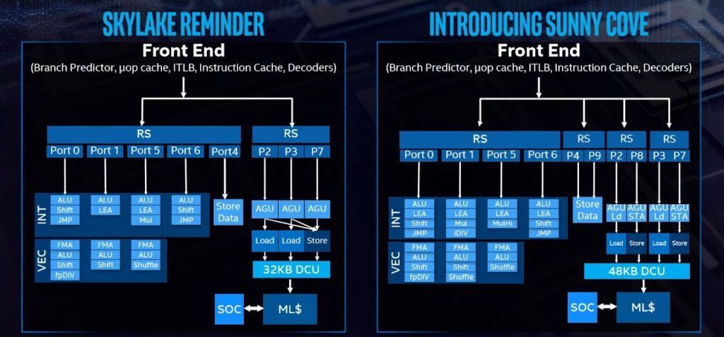การปรับปรุงสำคัญของ Sunny Cove คือเรื่องของการเพิ่ม IPC จึงทำให้ประสิทธิภาพของ Single-thread เหนือกว่า Coffee Lake แต่ยังไม่มีการพูดถึง clock speed ครับ