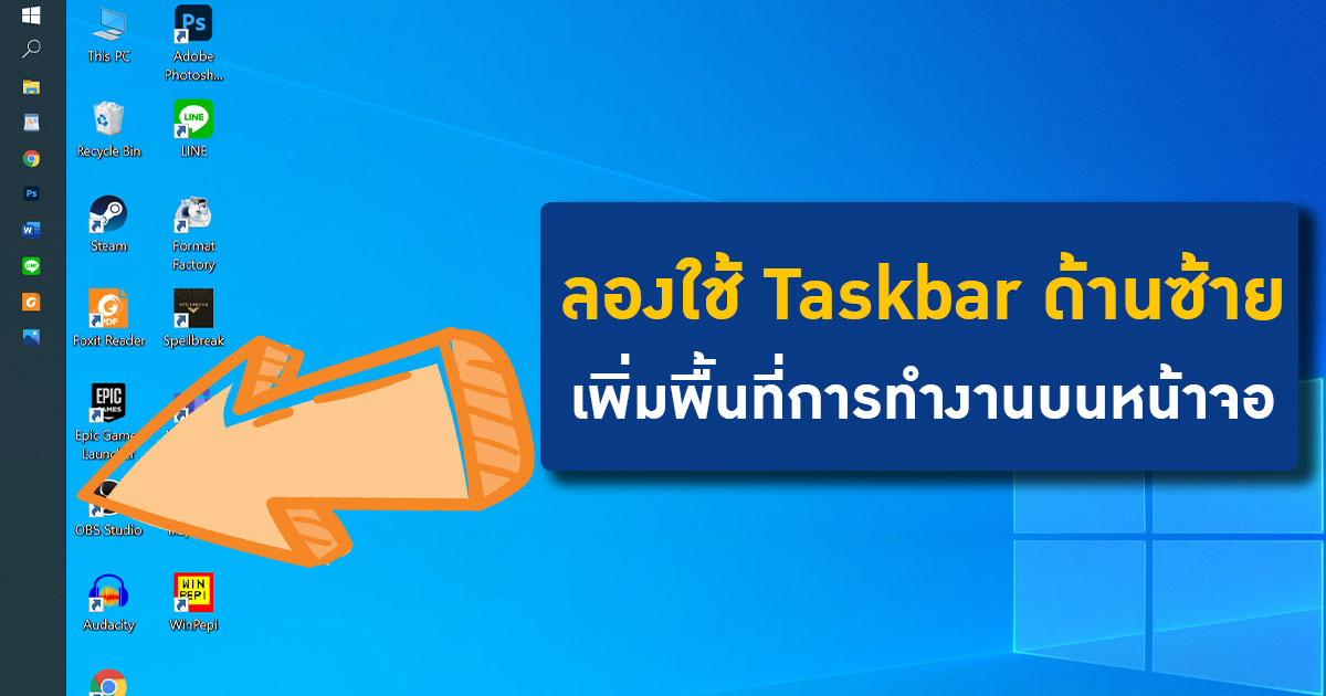 สำหรับบทความนี้เป็นเรื่องน่าสนใจที่ผมไปค้นเจอมา นั่นคือการจัดวางตำแหน่งของทาสก์บาร์ไว้ทางด้านซ้ายมือ แทนที่จะเป็นด้านล่างของจอตามแบบฉบับดั้งเดิมของ Windows ซึ่งผู้เขียนได้บอกว่าการจัดวางแบบนี้จะช่วยเพิ่มพื้นที่ในการทำงานได้