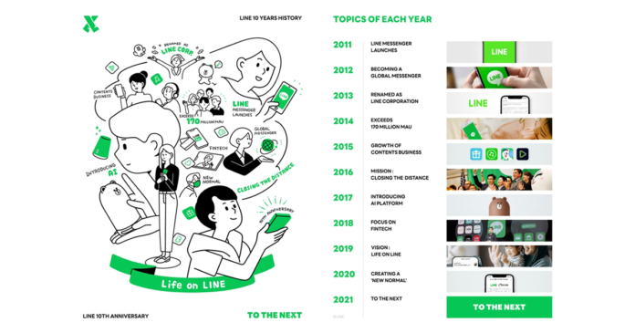 ไลน์ คอร์ปอเรชั่น ฉลองครบรอบ 10 ปี ด้วยการเปิดตัวคอนเทนต์พิเศษในรูปแบบวิดีโอและภาพกราฟฟิก ภายใต้แนวคิด “To The Next” โดยคอนเทนต์ดังกล่าวบอกเล่าถึงเรื่องราวการเดินทางและความสำเร็จของ LINE ตลอด 1 ทศวรรษที่ผ่านมา และแทนคำขอบคุณผู้ใช้งาน LINE ทั่วโลก