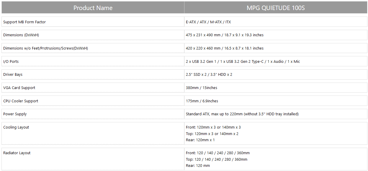 MPG QUIETUDE 100S เป็นเคสรุ่นแรกที่ MSI ออกแบบขึ้นโดยมุ่งเน้นไปที่การลดเสียงรบกวนขณะใช้งาน โดยเบื้องหลังความเงียบนั้นประกอบด้วยพัดลมรุ่นใหม่ MEG SILENT GALE P12 ที่สามารถสร้างการไหลเวียนของอากาศได้อย่างยอดเยี่ยม ในขณะที่ยังคงความเงียบในการทำงาน รวมถึงการติดตั้งแผ่นโฟมซับเสียงไว้ตามจุดต่างๆภายในเคส นอกจากนี้ ที่ IO port ของตัวเคส MPG QUIETUDE 100S ยังมีปุ่มปรับรอบการทำงานของพัดลม (RPM) ได้ถึง 3 ระดับ ที่ 100%, 70% และ 0% เพื่อให้ผู้ใช้สามารถปรับรอบพัดลมที่เหมาะสมได้ด้วยตนเอง ว่าจะเน้นไปที่ประสิทธิภาพการระบายความร้อน หรือต้องการความเงียบสูงสุด