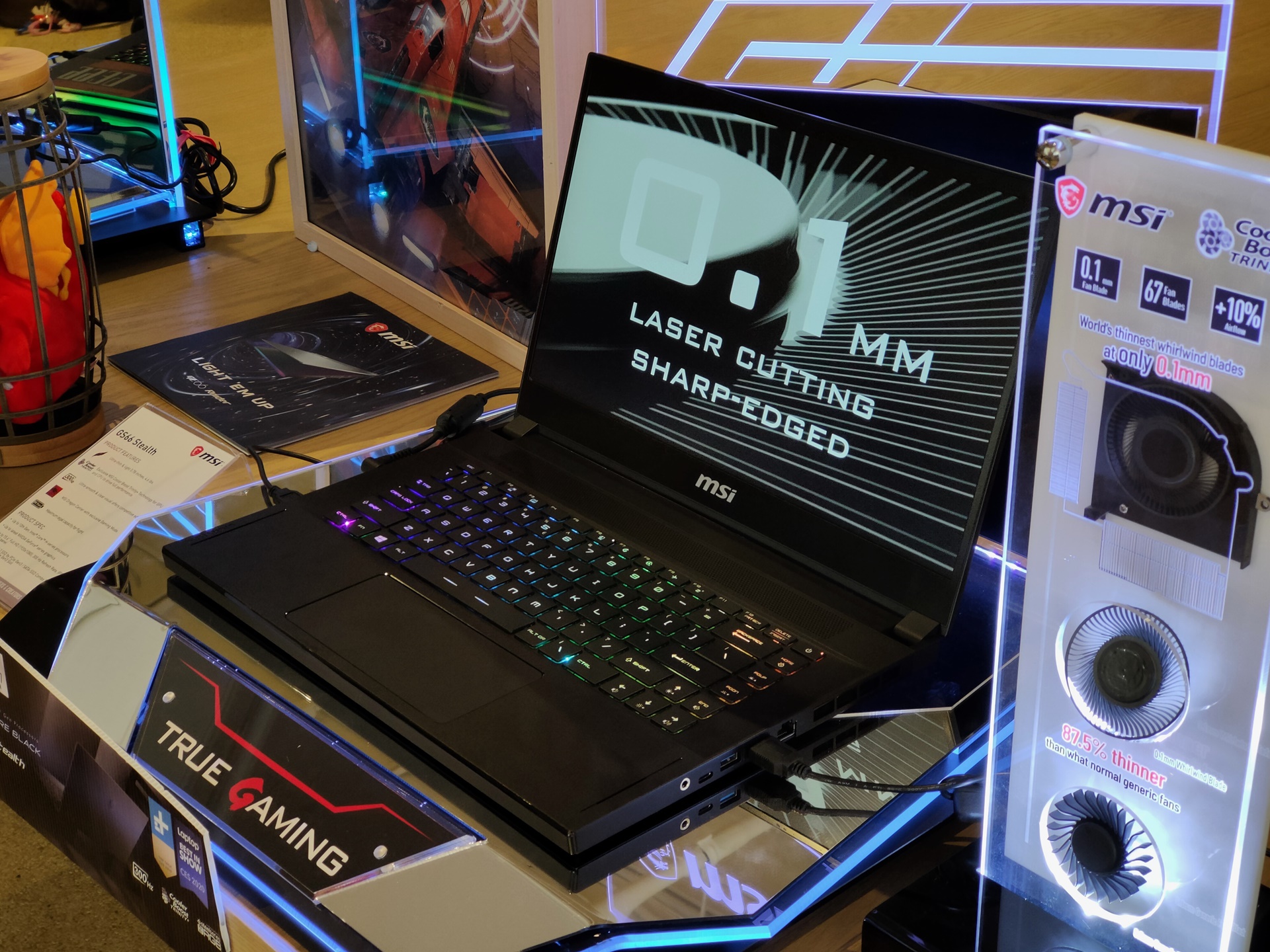 อีกตัวเป็นซีรี่ย์ที่ผมชอบเป็นการส่วนตัว MSI GS66 Stealth เกมมิ่งขนาดเล็ก สายพกพา โทนสีตัวเครื่องดำสนิทดูดุดัน พื้นผิวการสัมผัสดีมาก สเปคต่างๆยังจัดเต็มมาให้เช่นเดิมทั้ง CPU intel gen10 และการ์ดจอตัวแรงให้เลือกใช้ ซึ่งภายในงานได้ชูจุดเด่นเรื่องการระบายความร้อนของตัวเครื่องมาให้ได้ทราบ ทั้งพัดลมแบบใหม่ที่มีคลีบใบพัดเพิ่มมากขึ้นและบางลง ทาง MSI เรียกว่า Cooler Boost 5