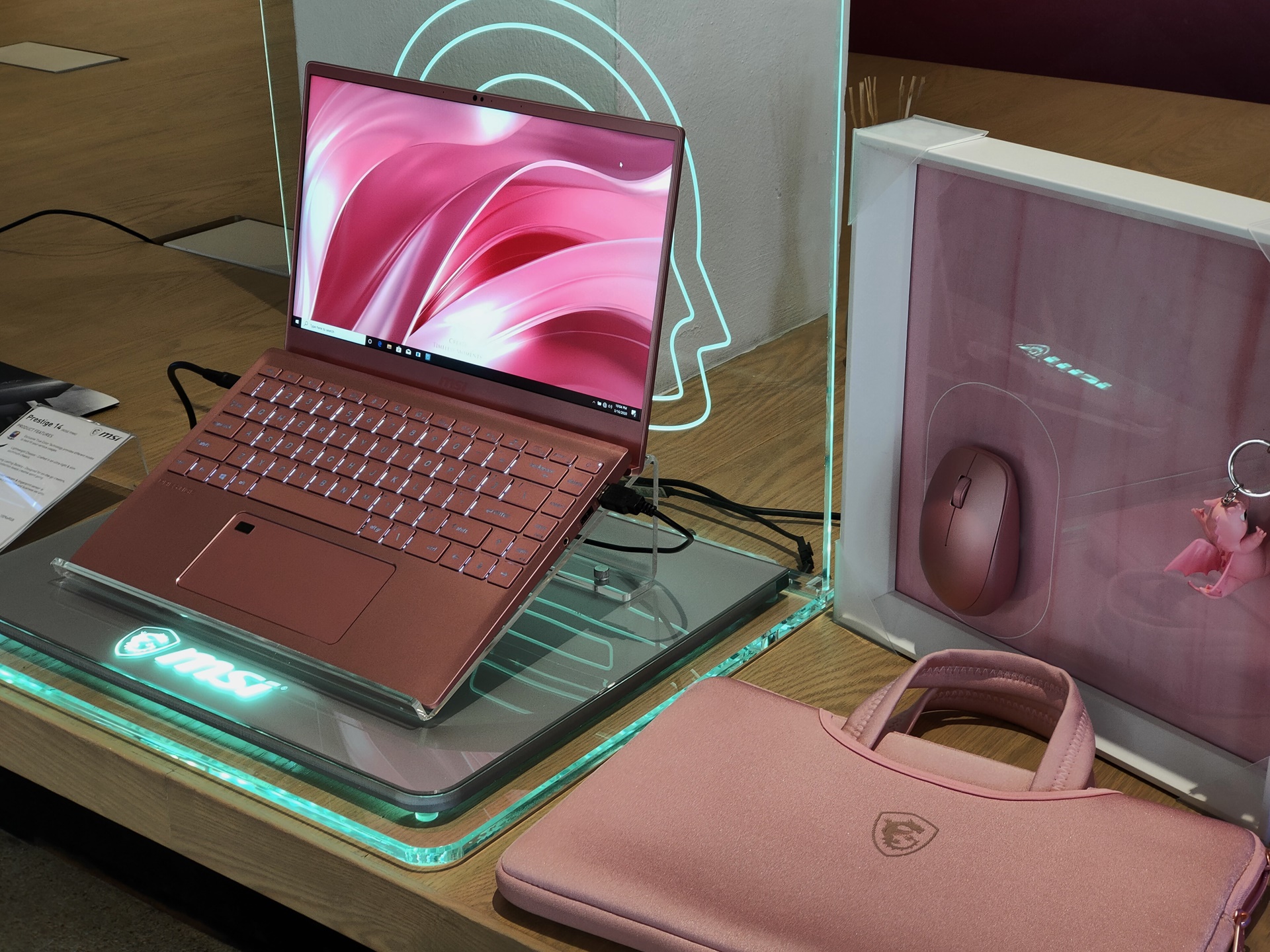 มาถึง MSI Prestige 14 สีชมพู เพิ่มความหวานให้ตัวคุณ รวมถึงกระเป๋าสวยๆก็เป็นสีชมพู สำหรับการพกพาออกไปใช้งานข้างนอกครับ ตัวเครื่องมีขนาดเล็ก บางและเบา เหมาะกับการใช้งานทั่วไป