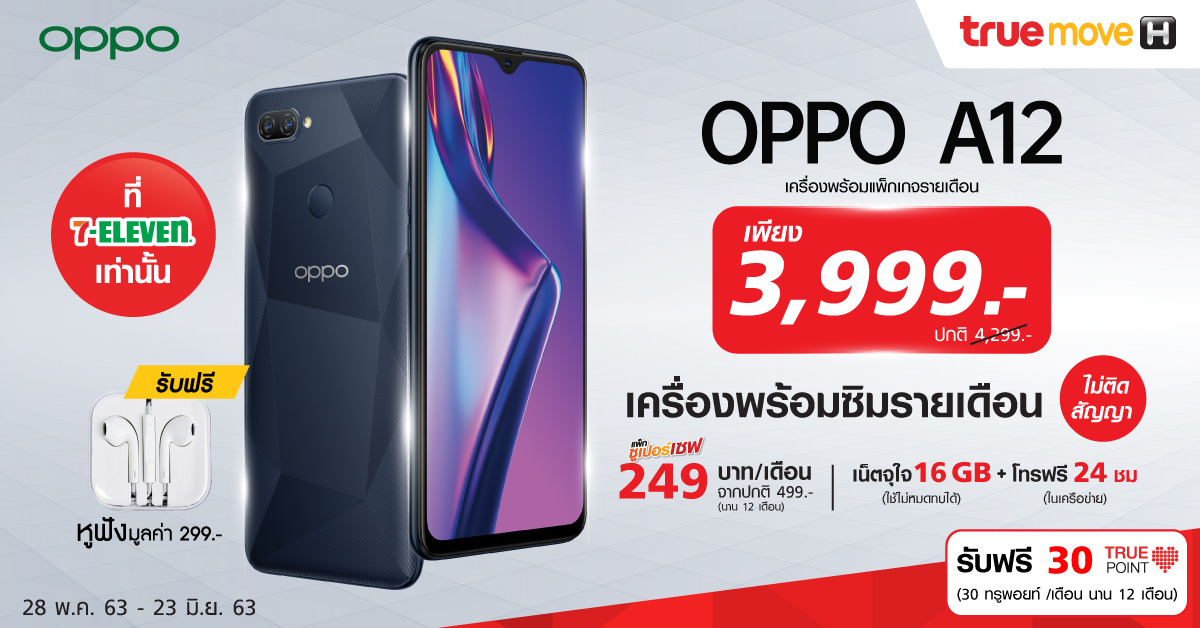 OPPO และ ทรูมูฟ เอช จัดโปรโมชั่นสุด Exclusive เมื่อซื้อสมาร์ทโฟน OPPO A12 ในราคาพิเศษ เพียง 3,999 บาท จากปกติ 4,299 บาท พร้อมแพ็กเกจรายเดือน เดือนละ 249 บาท จากปกติ 499 บาท โดยไม่ติดสัญญา พร้อมรับสิทธิพิเศษใช้เน็ตได้จุใจ 16GB เมื่อใช้ไม่หมดสามารถทบใช้เดือนถัดไปได้ สิทธิโทรฟรีในเครือข่าย 24 ชม. พร้อมรับฟรี 30 ทรูพอยท์ทุกเดือน (นาน12 เดือน รวม 360 ทรูพอยท์) และฟรีหูฟังมูลค่า 299 บาท ระยะเวลาโปรโมชั่นตั้งแต่ 28 พ.ค. – 23 มิ.ย. 63 เฉพาะใน 7-Eleven เท่านั้น
