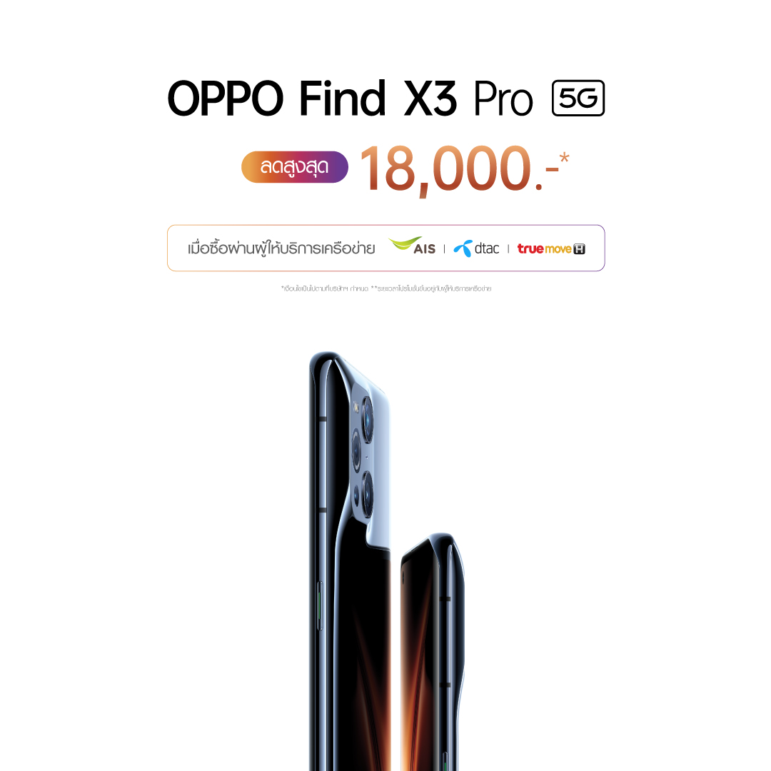 28 มิถุนายน 2564 กรุงเทพฯ – OPPO มอบส่วนลดสุดคุ้มกลางปี เมื่อซื้อ OPPO Find X3 Pro 5G สมาร์ทโฟนแฟล็กชิพที่สุดแห่งพันล้านสี ด้วยส่วนลดสูงสุดถึง 18,000 บาท ที่ OPPO Brand Shop, ผู้ให้บริการเครือข่ายและช่องทางจัดจำหน่ายที่ร่วมรายการทั่วประเทศ