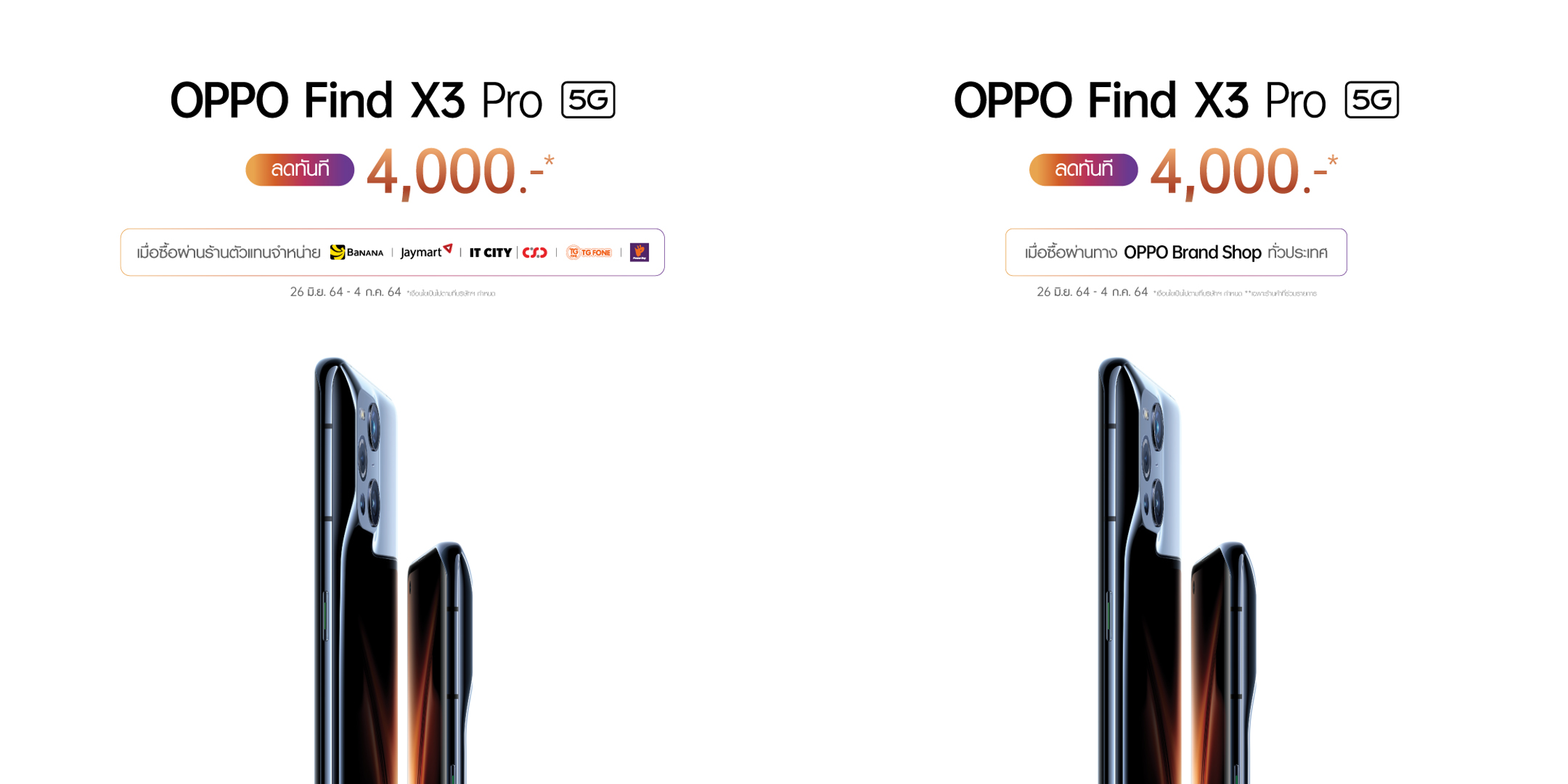 รับส่วนลดทันที 4,000 บาท เมื่อซื้อผ่าน OPPO Brand Shop สาขาที่ร่วมรายการและตัวแทนจำหน่ายที่ร่วมรายการ ได้แก่ Banana, Jaymart, IT CITY, CSC, TG FONE และ Power Buy