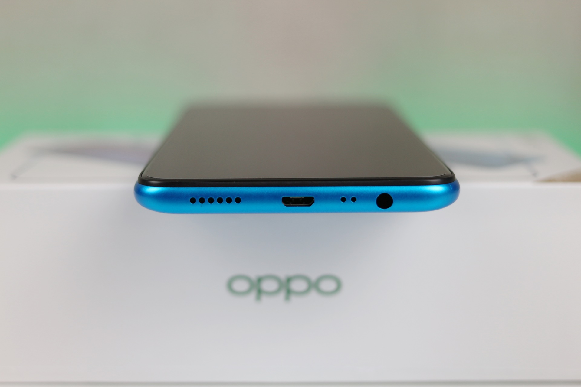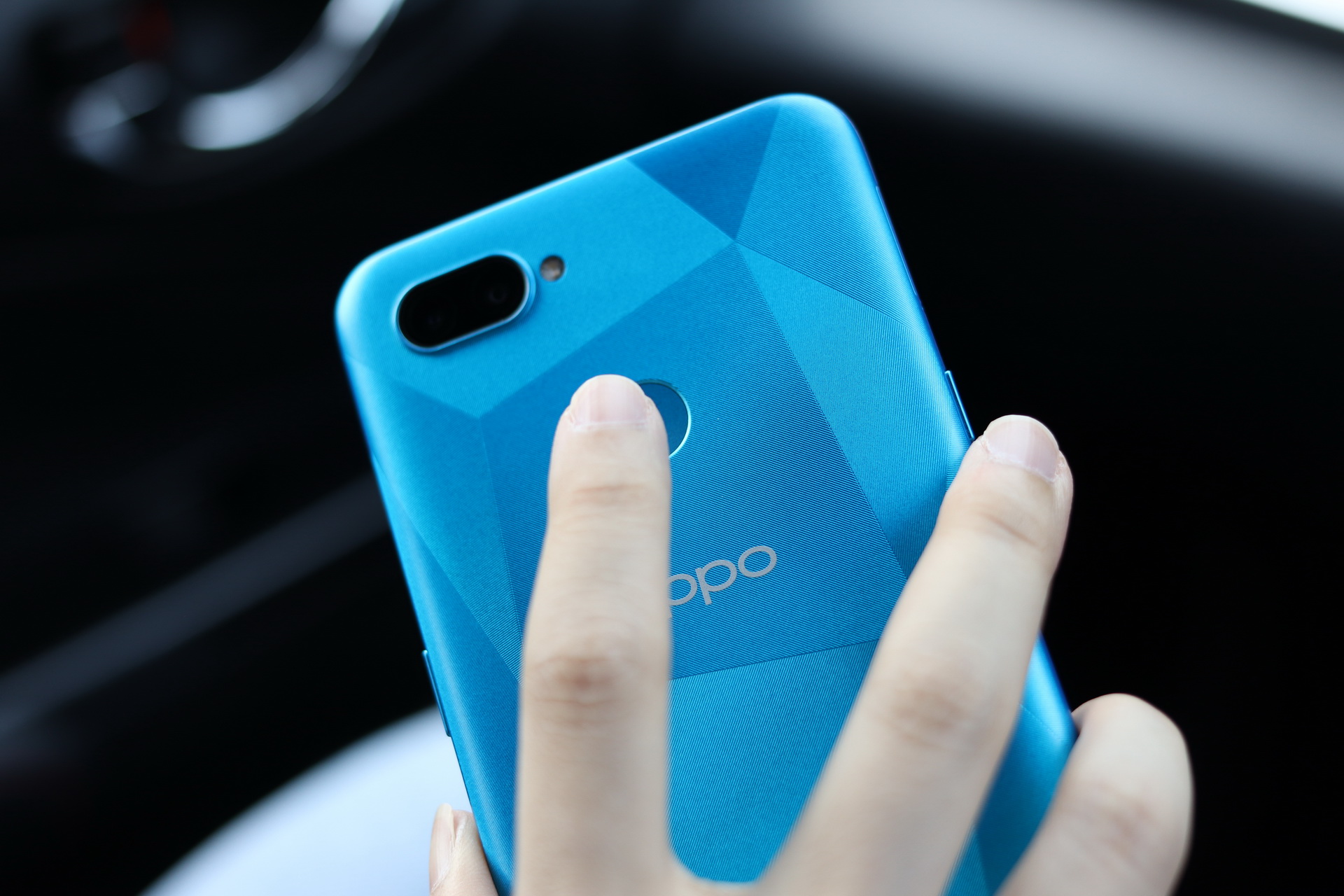 ด้านหลังจะประกอบไปด้วย กล้องหลัง AI คู่พร้อมไฟ LED ถัดลงมาจะเป้นตำแหน่งของปุ่มสแกนลายนิ้วมือ ถัดลงมาอีกจะเป็นโลโก้ OPPO เอง
