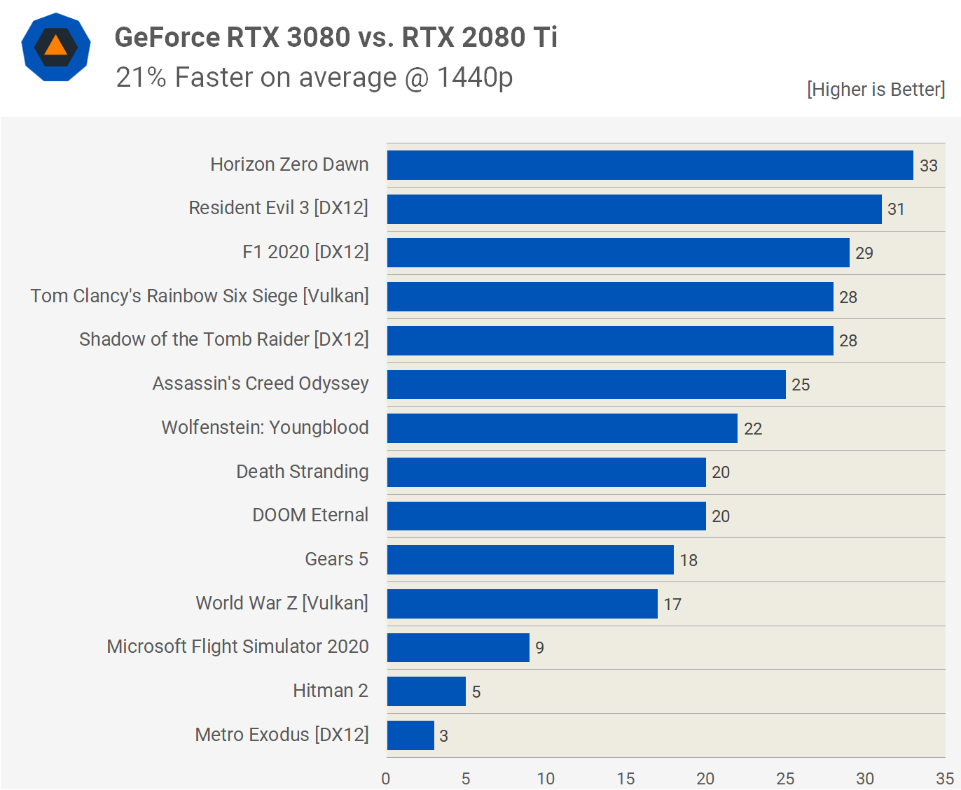 FPS แยกรายเกม เปรียบเทียบระหว่าง RTX 3080 vs. RTX 2080 Ti (หน่วย %)