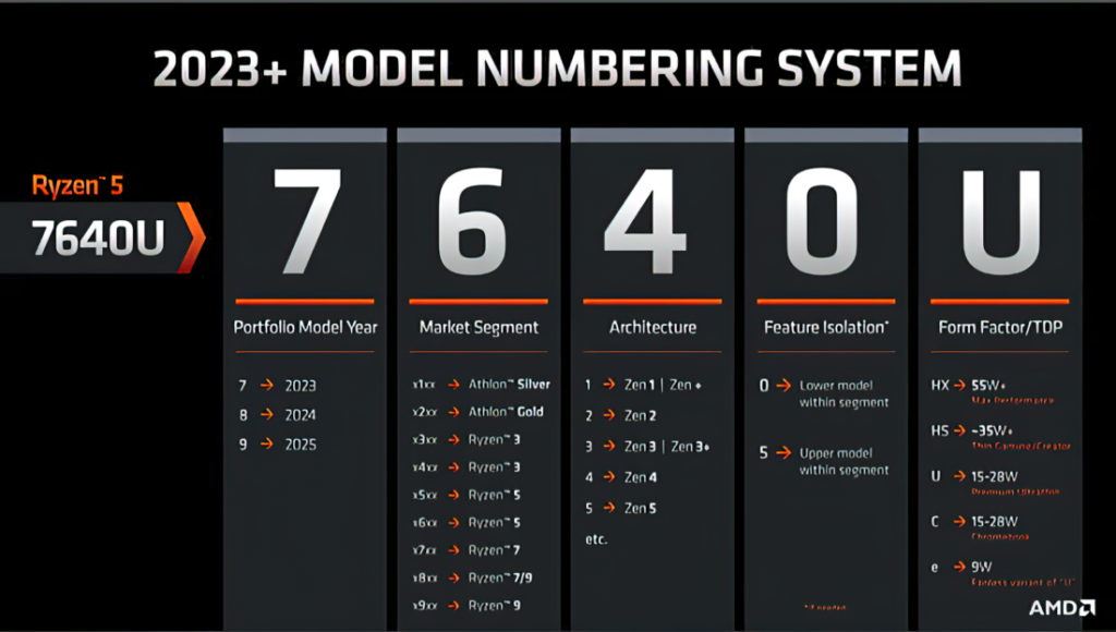 7845HX – 7 (โมเดลปี 2023), 8 (รหัสประจำ Ryzen 7/9), 4 (สถาปัตยกรรม Zen 4), 5 (ตัวท็อปของรุ่นในกลุ่มเดียวกัน), HX (TDP 55W+ เน้นการเล่นเกมและประสิทธิภาพสูงสุด) จะเห็นได้ว่า การปรับปรุงวิธีอ่านรหัสรุ่นของ AMD ช่วยให้เราทราบข้อมูลเกี่ยวกับตัวซีพียูได้มากขึ้น แต่ก็ต้องไปเรียนรู้ก่อนนะครับว่าตำแหน่งไหนบอกอะไรบ้าง