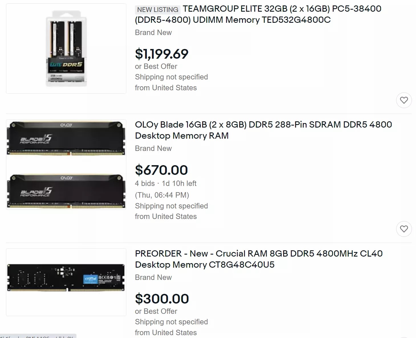 PCMag รายงานว่า แรม DDR5 หลายแบรนด์ถูกกว้านซื้อจากร้านค้าต่าง ๆ ก่อนที่จะถูกนำมาขายหรือประมูลในราคาที่สูงลิบลิ่วบนเว็บไซต์ Ebay อย่างแรม Dominator Platinum RGB 32GB (2x16GB) DDR5 5200MHz ยังตั้งขายในราคาสูงถึง 2,499 ดอลลาร์ (83,291 บาท) ทั้ง ๆ ที่ราคาหน้าเว็บ Corsair ตั้งไว้เพียง 349 ดอลลาร์ (11,332 บาท) นั่นเท่ากับว่าแรมตัวนี้แพงขึ้นถึง 635%
