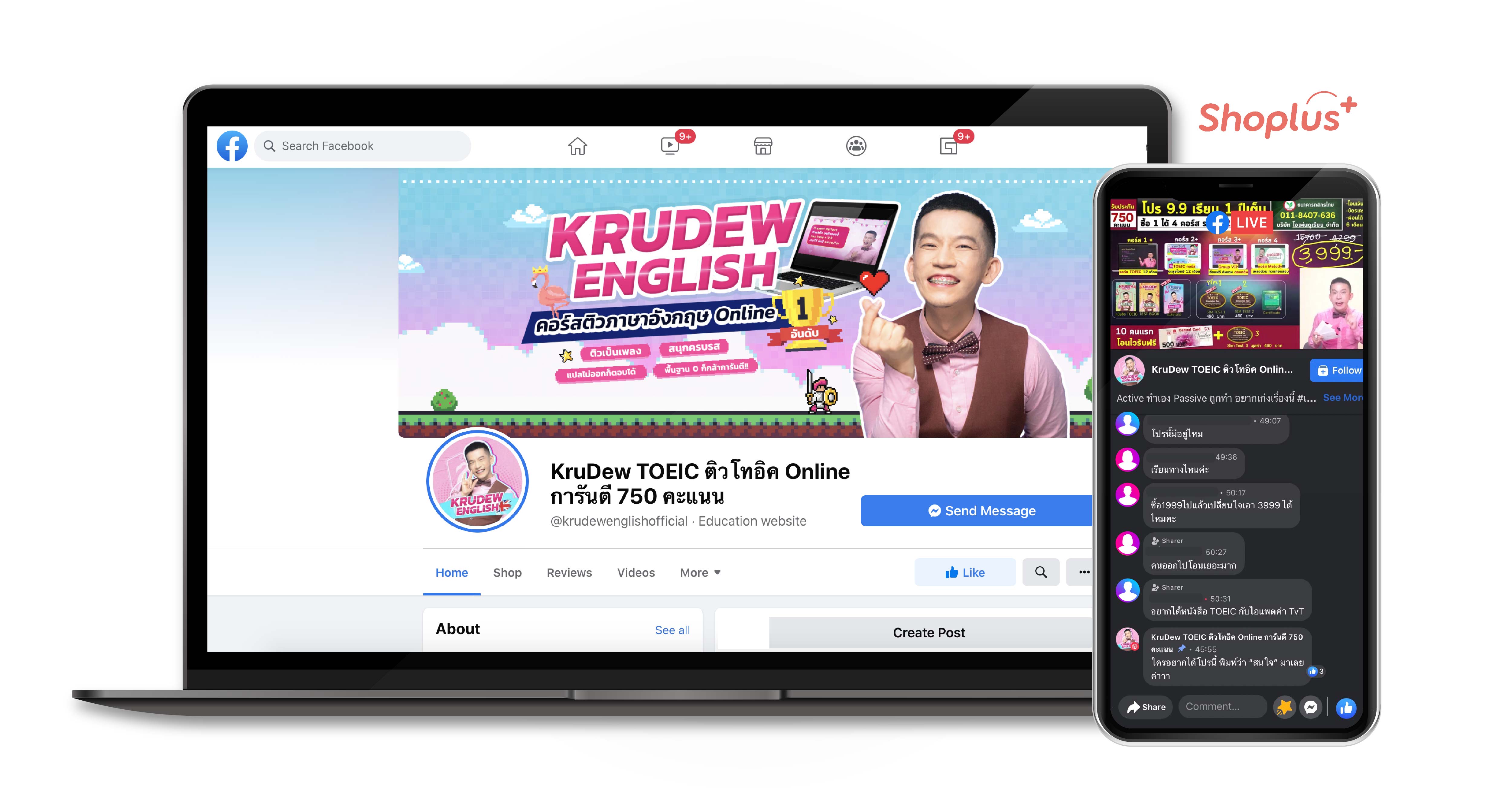 อีกตัวอย่างที่ตอกย้ำโอกาสของการขายสินค้าออนไลน์ คือ KruDew TOEIC ติวโทอิค Online การันตี 750 คะแนน ประสบความสำเร็จจากการไลฟ์สดบนเพจเฟซบุ๊กเพื่อติวคอร์สภาษาอังกฤษ TOEIC รวมถึงขายหนังสือเตรียมสอบและคอร์สติวสอบออนไลน์ โดยเพจเฟซบุ๊กของครูดิวมีผู้ติดตามสูงกว่า 1.3 ล้านคน ซึ่งการไลฟ์สดช่วยให้ครูดิวสามารถพูดคุยสร้างปฏิสัมพันธ์กับลูกค้ากลุ่มเป้าหมายกว่า 1 พันคนแบบเรียลไทม์ และสามารถขายสินค้าจำนวนมากต่อการไลฟ์สดแต่ละครั้ง ด้วยเทคโนโลยี AI ของ Shoplus เจ้าของร้านสามารถย่นระยะเวลาในการจัดการออเดอร์และมีเวลาในการเตรียมคอร์สมากขึ้น