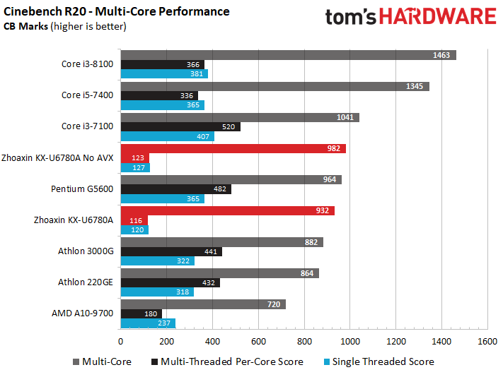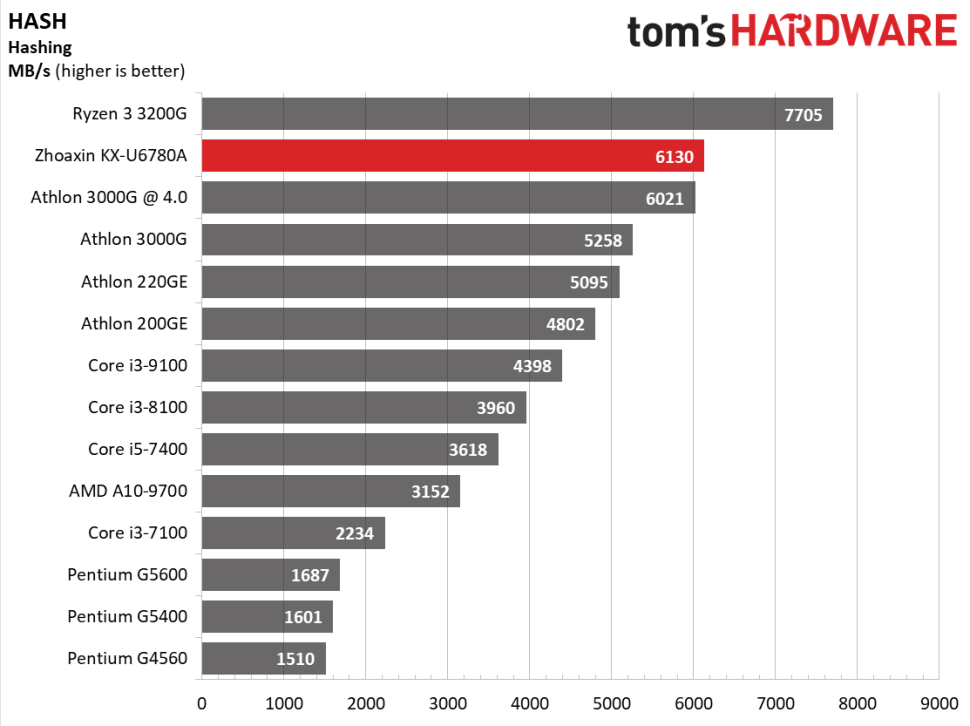 ผลการทดสอบด้าน IPC เจ้า Zhaoxin KaiXian KX-U6780A ถูกจัดให้อยู่ที่ 100% จะเห็นได้ว่า กระทั่ง A10-9700 สถาปัตยกรรมรุ่นเก่าที่มีชื่อเสียค่อนข้างมากของ AMD ยังได้คะแนนดีกว่า