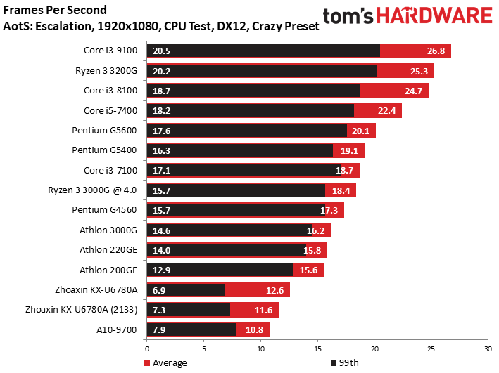 | Zhaoxin KX-U6780A DDR4-2133 (HP Driver) | 19 fps | 17 fps |